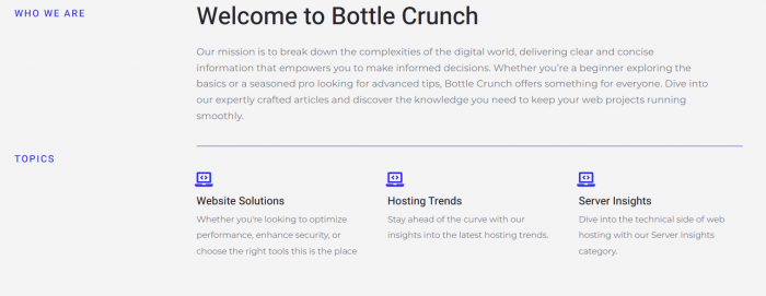 BottleCrunch positions itself as a guide to “crack open the world of hosting and web solutions,” with content designed to simplify the digital landscape for both beginners and more experienced users. The homepage headline and mission statement make its role explicit: it wants to “break down the complexities of the digital world” and provide clear, concise information that helps people keep their web projects running smoothly.