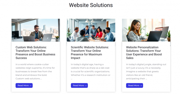 This section highlights case-style or explainer articles about specific types of websites and solution providers. Examples include: