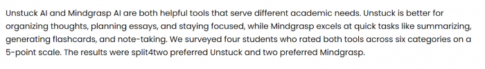 One of the more interesting things I’ve read is a structured comparison between Unstuck AI and Mindgrasp AI, where students tested both on the same tasks: summarizing videos, making flashcards and quizzes, generating essays, and organizing study materials.