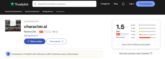 Character AI takes safety seriously but users should be cautious as on trustpilot its score is too less: