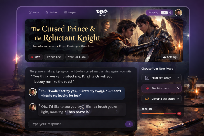 You start with a prompt box and a few decisions: genre, tone, and where you want to sit on the safe–NSFW spectrum. This is the surface layer. Behind that, DreamPress quietly offers structure: you can break sprawling tales into chapters, attach notes about your world’s politics or your characters’ trauma, and feed that context back into the model so it stops forgetting who hates whom and why.