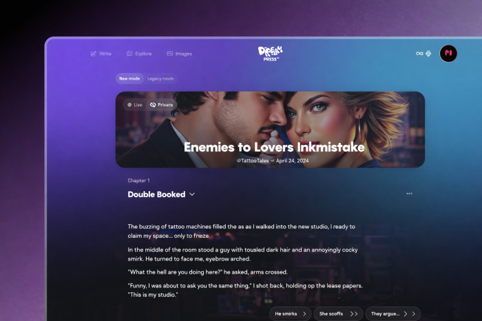 You keep going. Chapter two: you nudge the AI “more focus on their creative rivalry; no explicit content yet” and watch it adjust. Later, curiosity wins. You flip into a role‑play mode, inhabit one of the artists, and let DreamPress handle the other, volleying dialogue back and forth like a game of narrative ping‑pong.