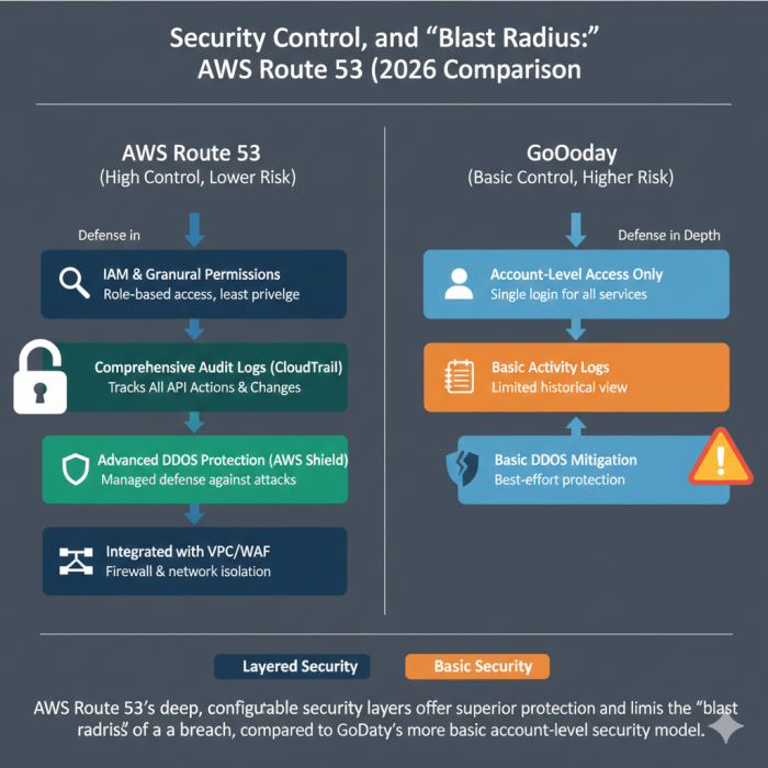 Route 53 also supports health checks that automatically reroute traffic when endpoints fail, something GoDaddy DNS does not do natively.