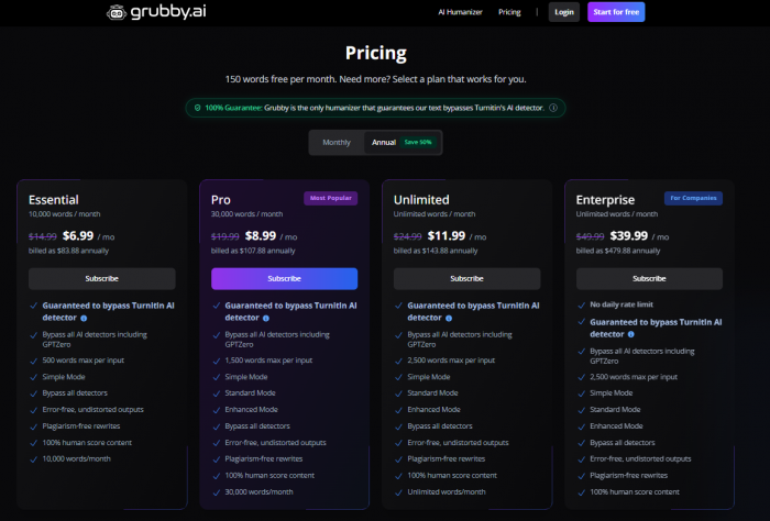 Grubby follows a familiar freemium pattern. The free tier is intentionally limited: you get enough words per month to test the tool on a few essays or small chunks of content. This is perfect for curious students or cautious writers who want to see how far detection scores can be pushed without paying.