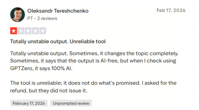 There are also critical voices. Some trustpilot users complain that the humanized text can feel awkward or inconsistent, forcing them to spend more time fixing it than if they had just edited the original draft by hand. Others are uneasy about the ethics, especially in academic settings, and share stories of peers over‑relying on such tools and facing serious consequences when detection or policy caught up. A few comments focus on practical issues like billing confusion, unclear communication about changes, or the sense that the tool overpromises with phrases like “undetectable” when real‑world results are much less certain.