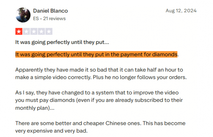 "It was going perfectly until they put in the payment for diamonds. Even if you are already subscribed to their monthly plan, you must pay diamonds to improve the video. This has become very expensive and very bad."