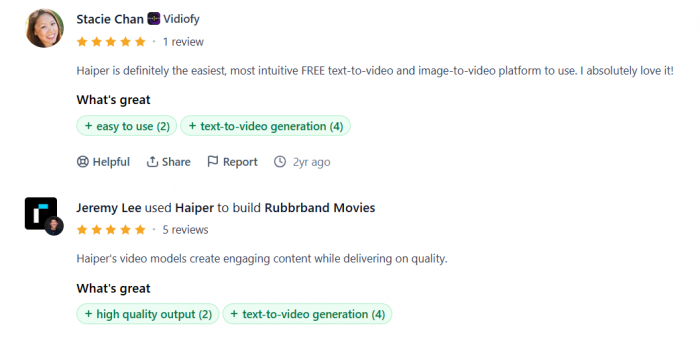 “I am the most satisfied with Haiper and love it the most out of all the AI generators I've tried. The generations are always amazing. Very powerful tools for text-to-video and image-to-video. Easy to use and versatile.”