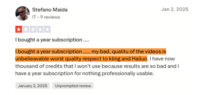 “I bought a yearly subscription. Quality of the videos is unbelievably worse than Kling and Hailuo. I now have thousands of credits I won't use because results are so bad and I have a year subscription for nothing professionally usable.”