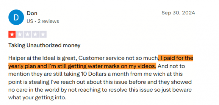 “I paid for the yearly plan and I'm still getting watermarks on my videos. They are still taking $10 a month from me which at this point is stealing. I've reached out about this issue before and they showed no care in the world by not responding.”