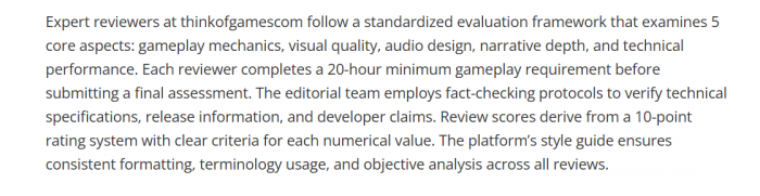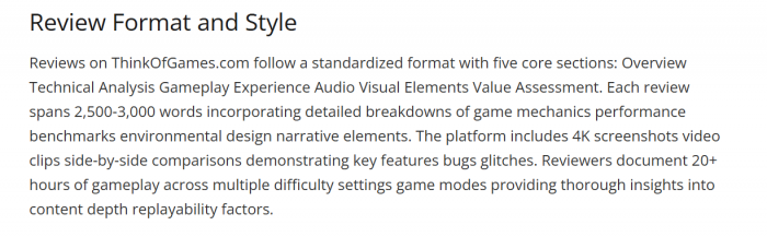 ● Each article typically runs 2,500 to 3,000 words, with reviewers logging 20+ hours of play across multiple modes and difficulty levels before scoring.