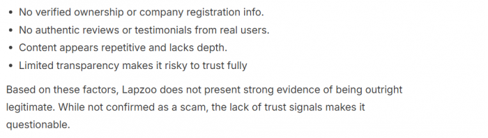 ● Multiple independent reviews explicitly question whether Lapzoo is “legit or a scam”, not because of malware, but because of hidden ownership, generic content, and a lack of clear accountability.