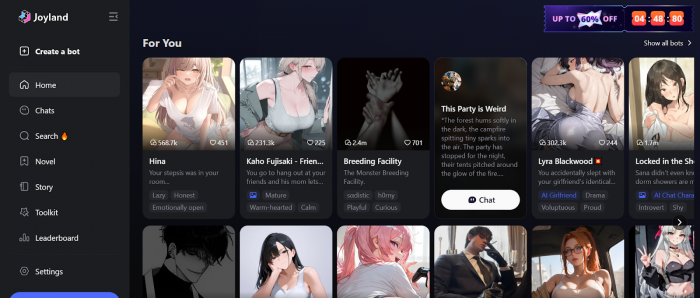 When I first landed on Joyland’s homepage, it didn’t feel like a typical AI app. There’s no corporate dashboard or productivity vibe, just a wall of characters staring back at you: anime girlfriends, flirty bartenders, demon princes, teachers, witches, best friends, and “comfort” characters of every kind.