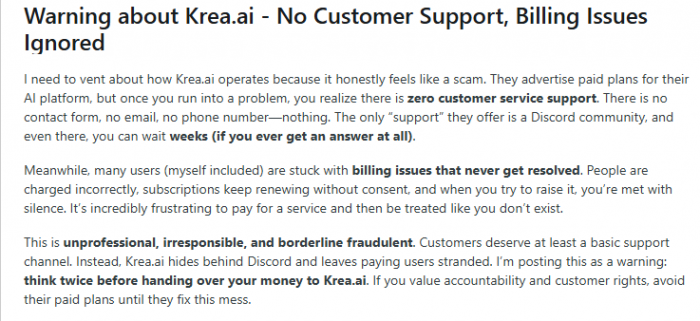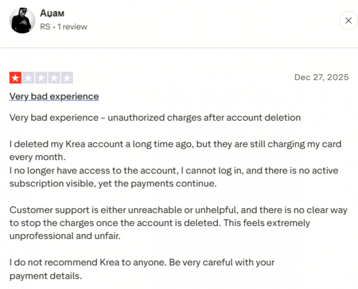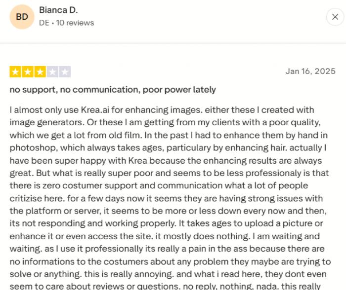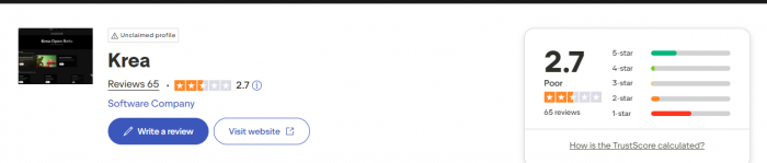 Krea’s Trustpilot profile shows a mixed to negative TrustScore around ~2.7/5, with many complaints about billing, support, and reliability but some users do praise certain features.