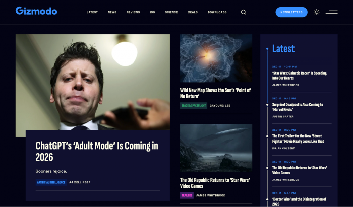 Gizmodo blends technology, science, and internet culture, offering articles with personality and strong editorial voice. It publishes hands on reviews, cultural commentary, and deeper reporting than anything found on Lapzoo.