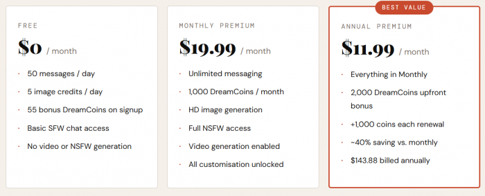 The annual premium plan at $9.99 monthly represents the strongest value proposition, offering all features at half the cost of monthly billing while including bonus DreamCoins.