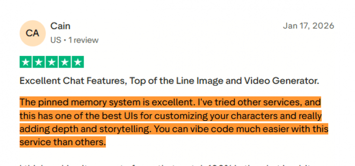 Exceptional AI intelligence: Users praise the system's ability to generate compelling stories and characters while facilitating engaging conversations. The AI maintains context across sessions without the repetitive loops affecting competitor platforms.