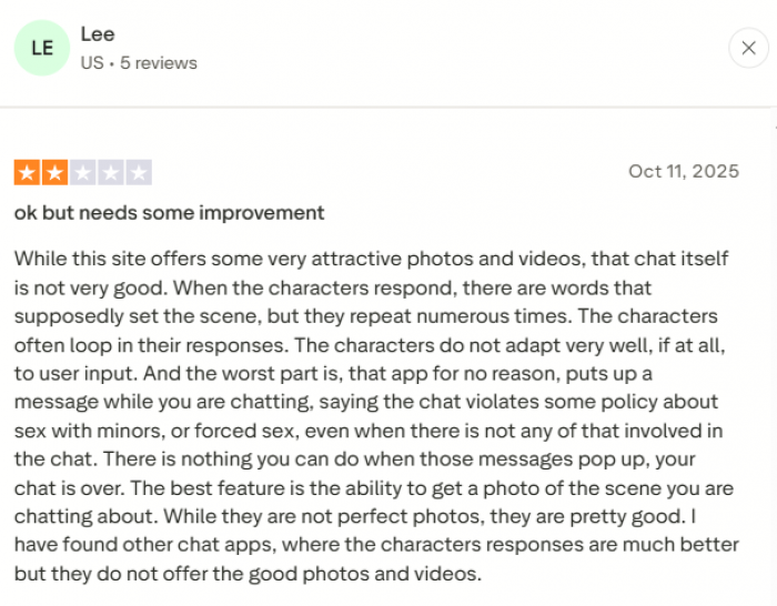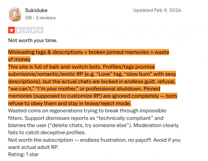 Content pacing concerns: Conversations sometimes escalate into NSFW content faster than anticipated. Additionally, filters occasionally become overly restrictive or ignore pinned memories, leading to repetitive chat experiences.