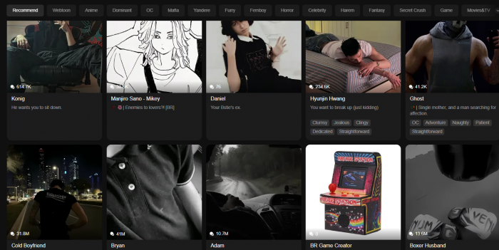 You can search by name or tags and browse themed sections (e.g., romance, friends, fantasy), which makes it easy to drill into a niche. However, curation quality is mixed: while you’ll find some highly polished bots with great descriptions and cover images, the long tail is noisy, with many near‑duplicates and clickbait‑style characters vying for attention.