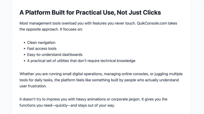 Readers should approach the site with realistic expectations. It works well as a light information source, but its lack of a focused niche limits its authority. For anyone searching for a real tool or dashboard, Quikconsole.com will not meet that need. For casual reading, however, it performs exactly as a blog should.