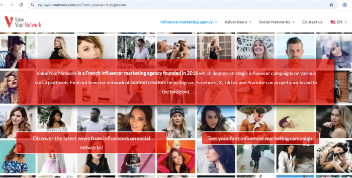 ValueYourNetwork is a French influencer marketing agency founded in 2016 that designs and deploys strategic influencer campaigns across major social platforms including Instagram, Facebook, X (Twitter), TikTok and YouTube. (ValueYourNetwork)