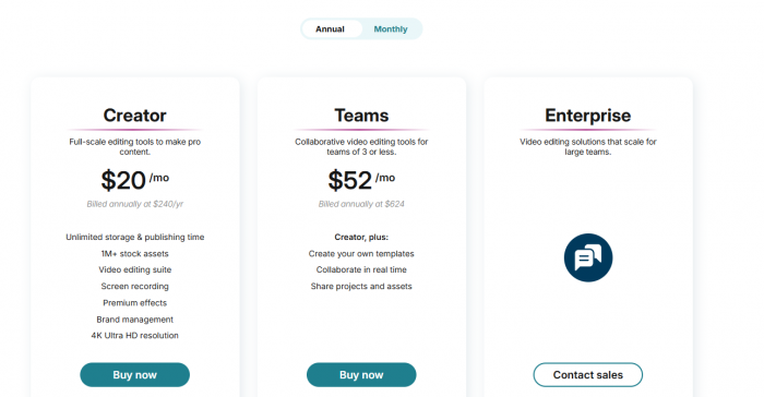 ● Education / Teams / Enterprise: the coordination tier. You’re not just buying features; you’re buying rosters, governance, collaboration, and support to run WeVideo at the scale of a school, district, or department.